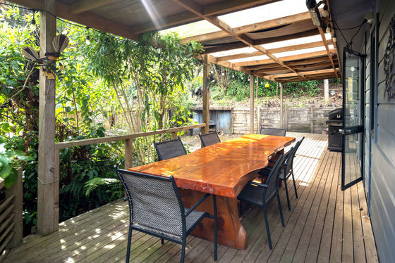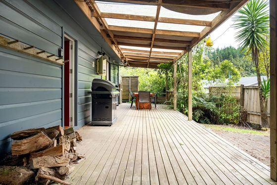 Inside, the open-plan kitchen and living space creates a warm and welcoming hub, complete with a wood-burning fireplace for cosy winter getaways. Step through to the covered, all-weather deck ideal for year-round entertaining, with a custom macrocarpa table perfect for hosting family lunches or evening drinks.