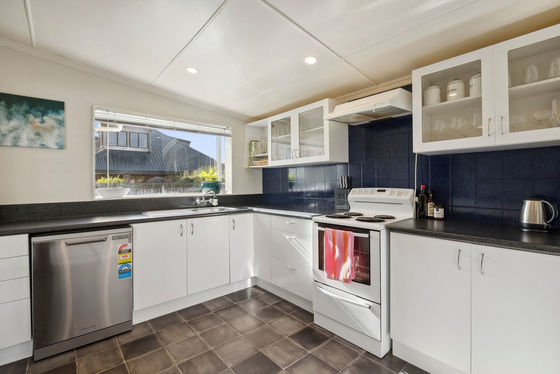 At the rear of the house, the spacious modern kitchen is highly functional with lots of bench space for food preparation, and plenty of drawers and cupboards to put all your kitchen things. Adjoining is a dining area complete with ample storage, perfect for daily living or entertaining. Nearby is a separate laundry and a back door that leads out to carparking, a carport with an adjacent shed and the delightful section.