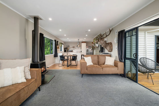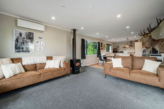 The heart of the home is the modern designer kitchen with sanded and varnished native timber flooring, a gas hob, and electric oven, ideal for those who love to cook or entertain. The open-plan kitchen and dining area flow seamlessly into the carpeted lounge, which includes another heat pump and a log burner for that winter warmth, and dual sliding doors that open onto the sun-soaked deck.