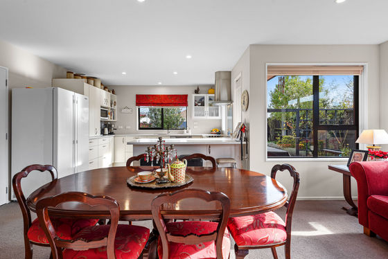 The spacious open-plan dining and lounge area flows effortlessly out to a patio, creating a welcoming space for relaxing or entertaining.