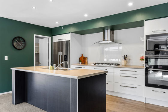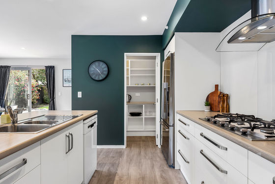 The modern kitchen boasts a double wall oven, gas cooking, and a walk-in pantry, while the separate laundry and ample