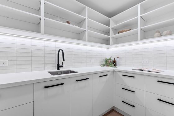 • Kitchen includes an induction cooktop, double ovens, and a walk-in pantry with sink