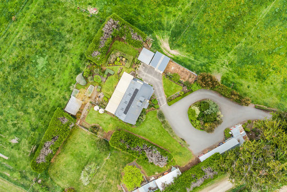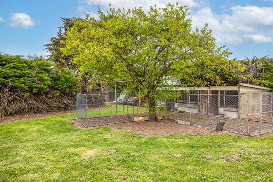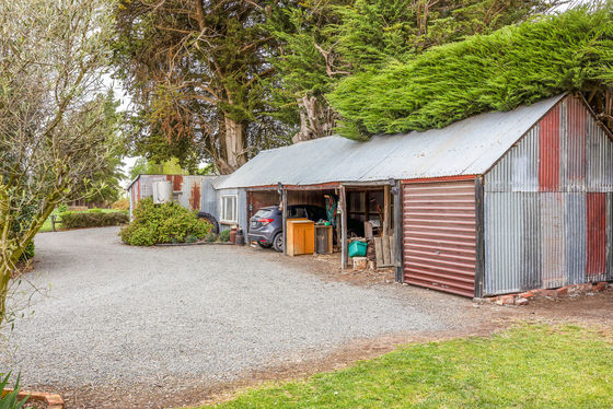 Surrounding the home are well-maintained lawns, fruit trees, and older sheds offering practical storage solutions.