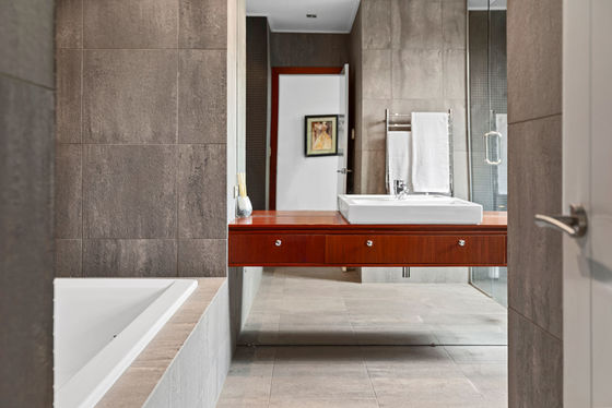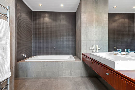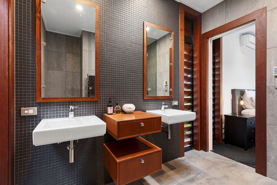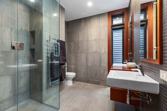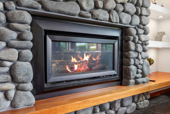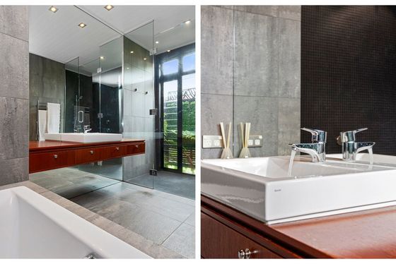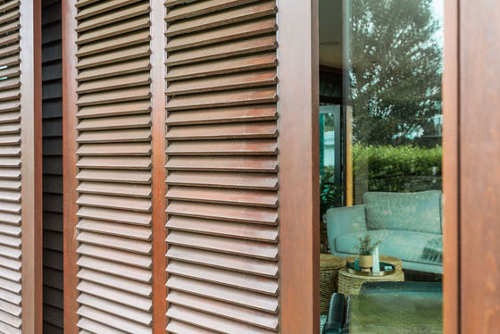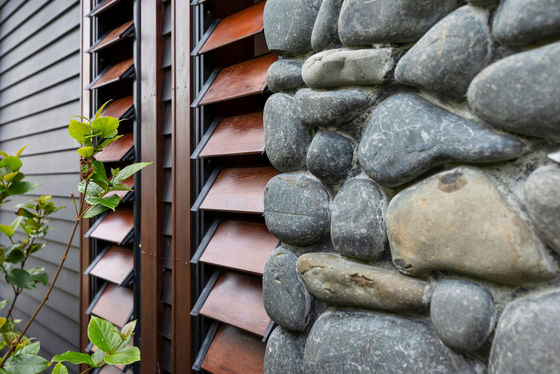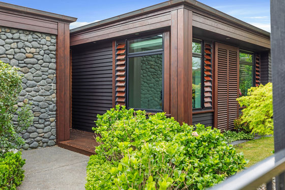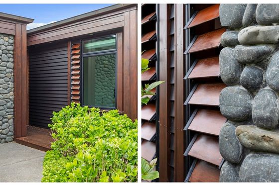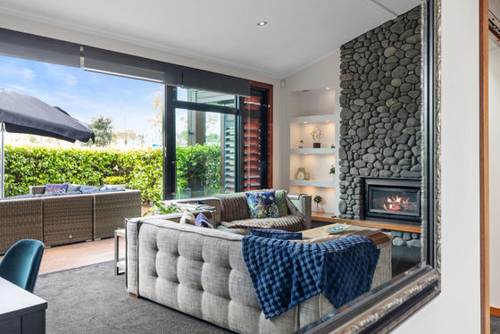 Premium features include motorised exterior wooden shutters, real stone masonry in the cladding and fireplace, and underfloor heating in all bathrooms.