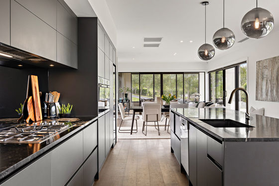 - Sleek, dark-toned designer kitchen with granite benchtops, dual ovens, gas hobs, and a butler's pantry