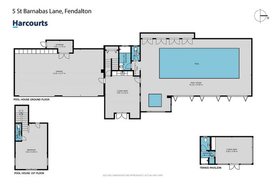 The self-contained pool house is an oasis boasting a cozy lounge , a spacious upstairs bedroom/living area, and a pool room with a heated pool and a separate spa, perfect for year-round relaxation. Overlooking the full size Astro turf tennis court lies a charming summer house complete with a lounge, kitchenette, and shower facilities, ideal for guests or as a private retreat.