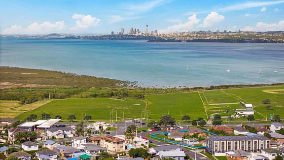 The site is elevated above Te Atatu Road with wide views across Orangihina Park, Rangitoto Island, and the Auckland CBD skyline. The contour and dual access points provide development flexibility and efficient layout potential.