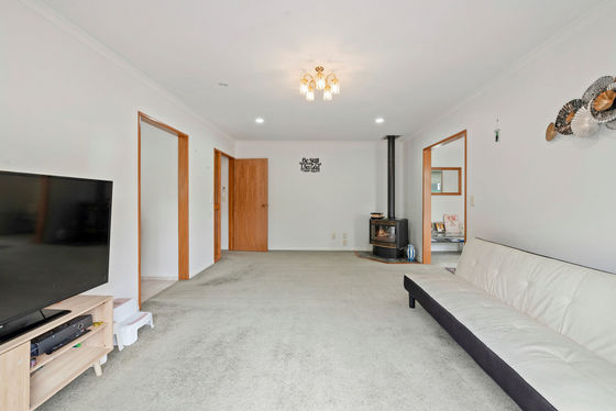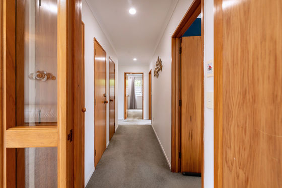 A wide hallway guides you to the bedroom wing, where three spacious bedrooms await. The master enjoys an ensuite and large wardrobe, while the family bathroom includes a bath, ideal for young ones. Quality Rimu doors and frames add timeless character and a separate laundry provides direct outdoor access to the utility area.
