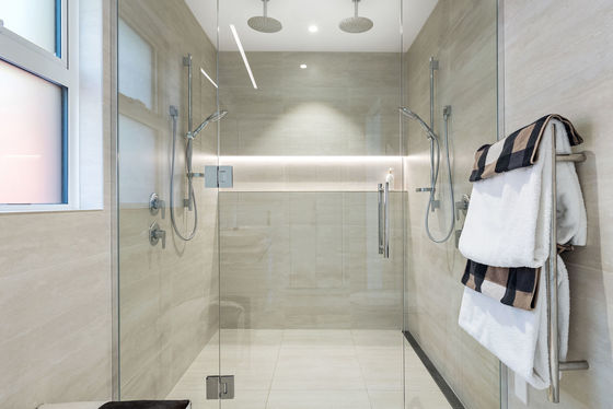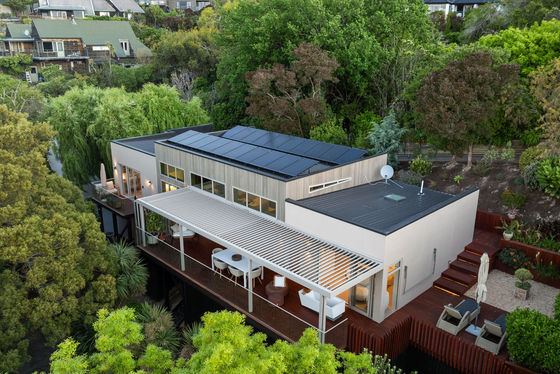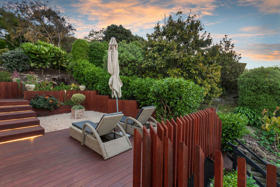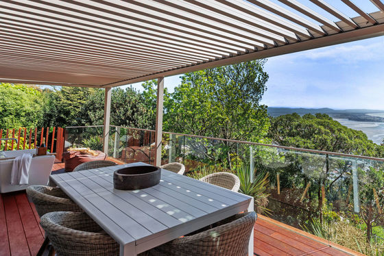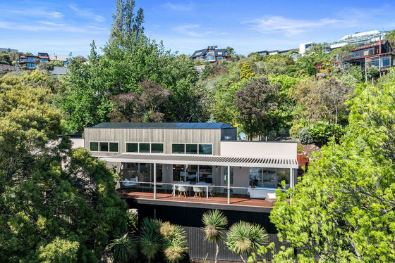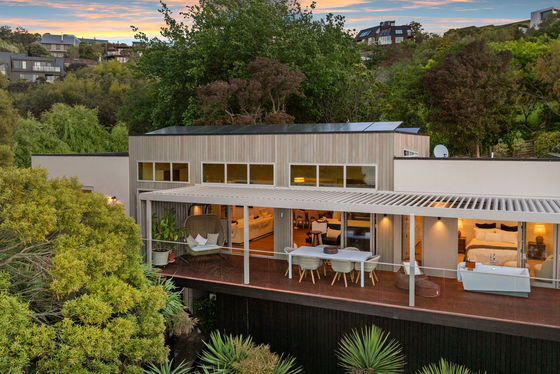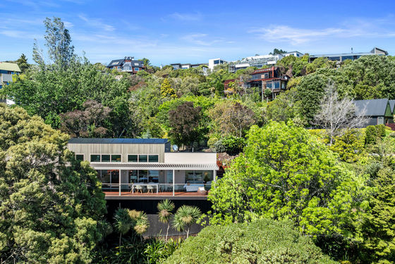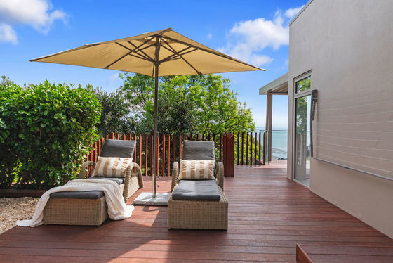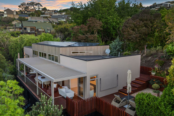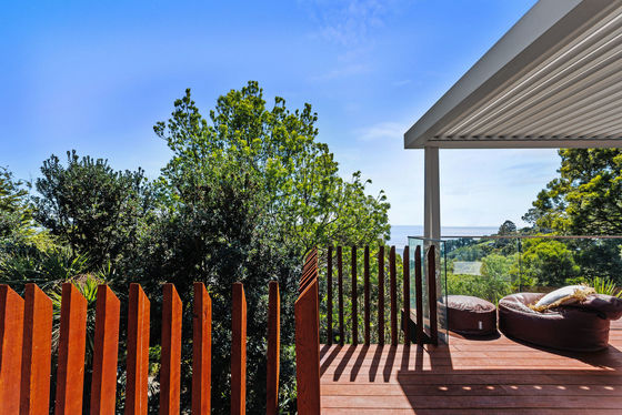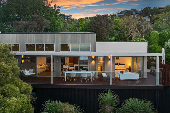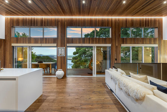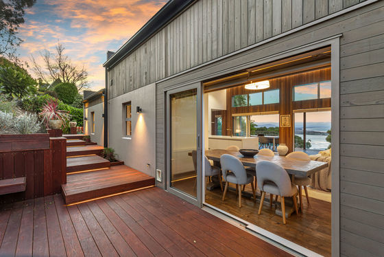 The louvred front deck is a true extension of the home, privately framed amongst the trees where you can enjoy a luxurious Kohler air-bubble bath and peaceful views over Moncks Bay. Evenings transform the setting completely, with architectural lighting illuminating the landscape and softly defined pathways.