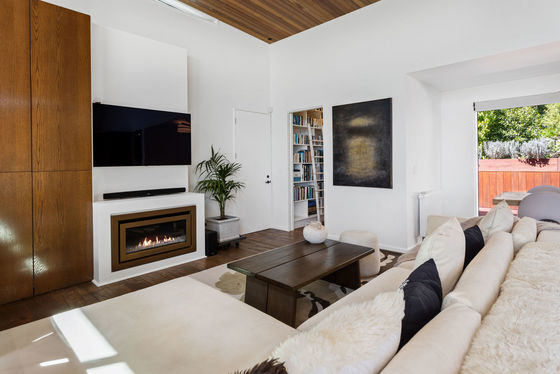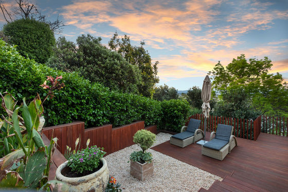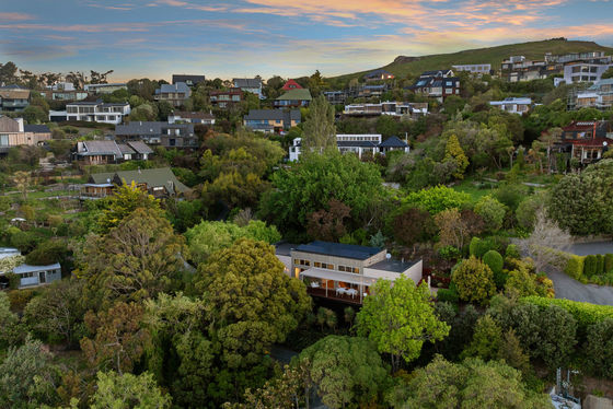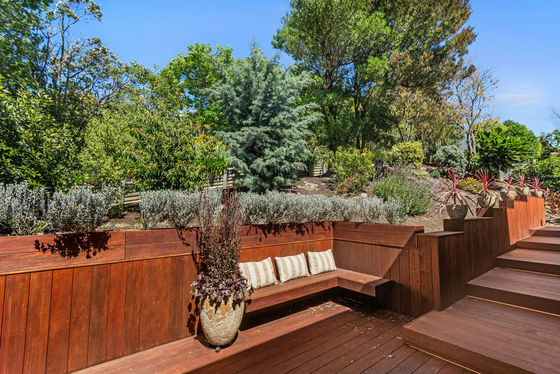 The home is centred around a light-filled open-plan living, dining and kitchen space, crafted with warm cedar detailing, rafted ceiling and celestial windows that invite the landscape in. Oak flooring, textured wool carpets and bespoke lighting establish an atmosphere of natural elegance, while sliding doors extend the living space to both a sheltered rear courtyard and an elevated front deck. The connection between architecture and environment is constant - birdsong, dappled light and gently shifting greenery are present from every angle.