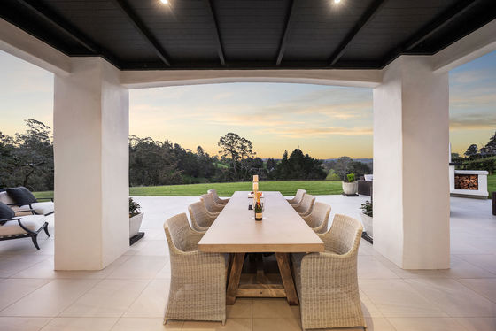 The designer kitchen is a culinary enthusiast's paradise, featuring an enormous island bench that serves as both a functional workspace and a social hub. It is equipped with a spacious scullery, top-of-the-line appliances, and exquisite finishes that elevate the cooking experience. This culinary haven effortlessly connects the formal dining area and informal lounges, leading out to a spectacular outdoor entertaining space adorned with a large fireplace, perfect for memorable summer evenings spent with family and friends.