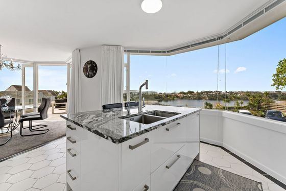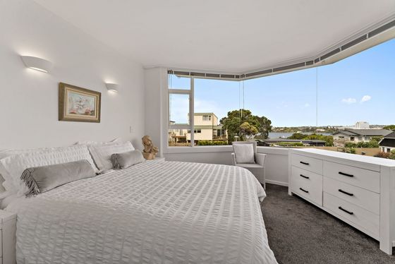There are three spacious double bedrooms, each enjoying a different aspect, offering impressive views over the sea to the north, the city to the south, and the lake to the east. The master suite includes a walk-in wardrobe and ensuite bathroom, while the other two bedrooms (one currently used as a large office) are serviced by a second bathroom and a separate laundry room. The apartment enjoys strong, elevated, 360-degree vistas and a peaceful garden outlook that enhances its connection with the surrounding landscape. Ample storage throughout, a double garage, and an additional storage unit complete the offering.