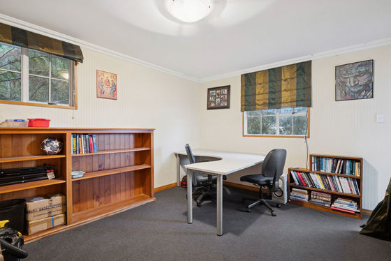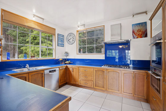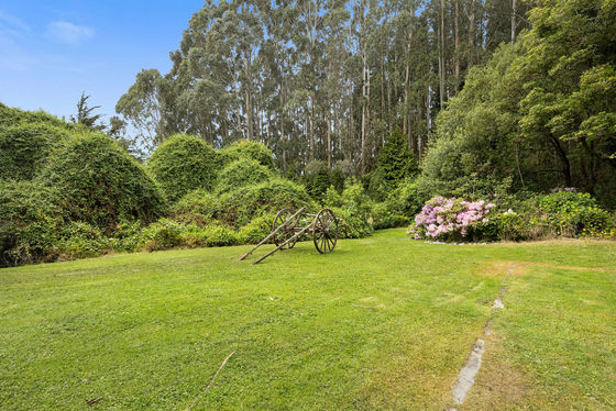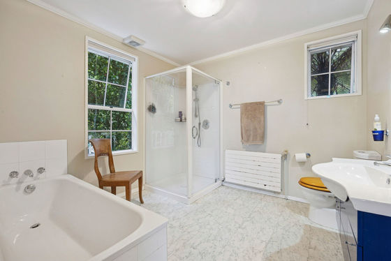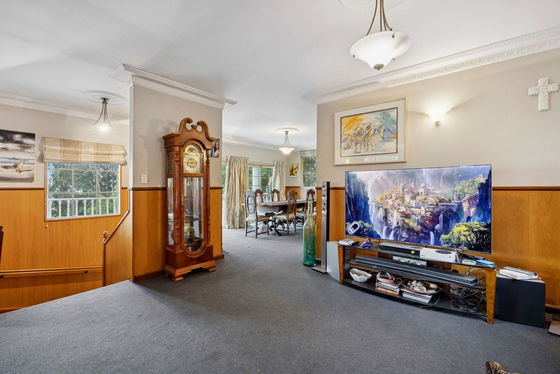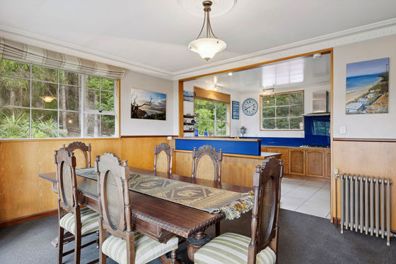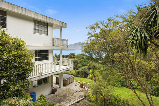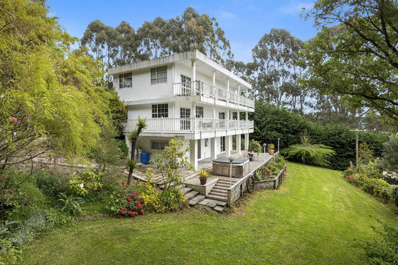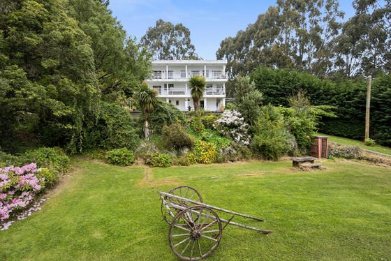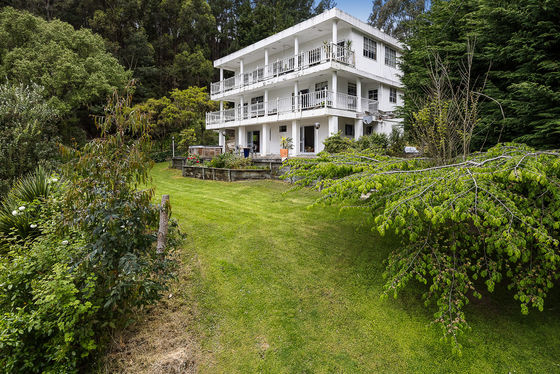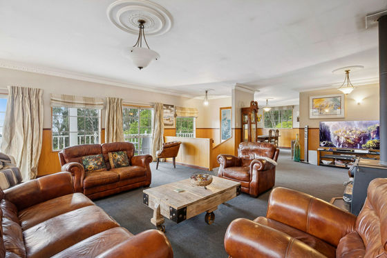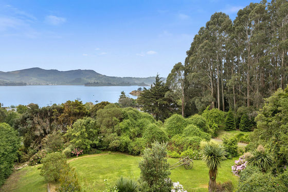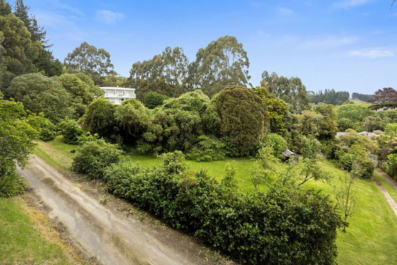 The property comprises a multi-level 1980s-built home of five bedrooms and four bathrooms, large outbuildings, a stand of lofty trees and open land suitable for potential residential development (subject to feasibility and necessary consents).
