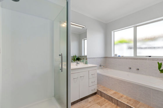 This property features four bedrooms, including one without a wardrobe, ideal as a home office, study, or hobby room. The master bedroom boasts an ensuite and a walk-in wardrobe, while the main bathroom includes a separate toilet for added convenience.