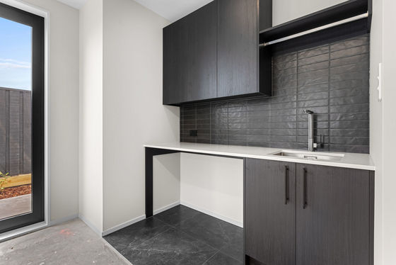 HEART: The striking kitchen showcases rich dark-timber cabinetry complimented by LED lighting and featured shelving, creating a warm yet contemporary aesthetic. A large walk-in pantry and expansive island bench make this a dream space for any home chef, while the open-plan design connects seamlessly to the living and dining zones.