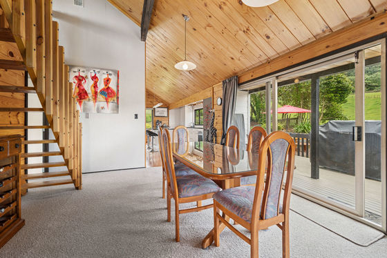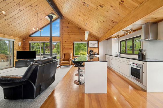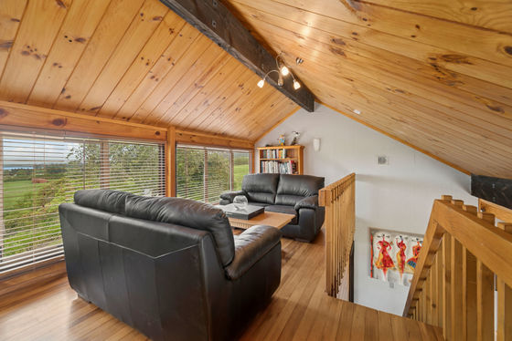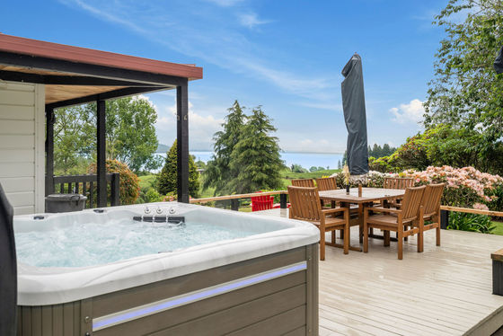 The home's modern kitchen features sleek granite benchtops, while the open plan living area captures views of Lake Rotorua throughout most of the home. A mezzanine floor adds an architectural touch, creating a sense of light and space throughout.