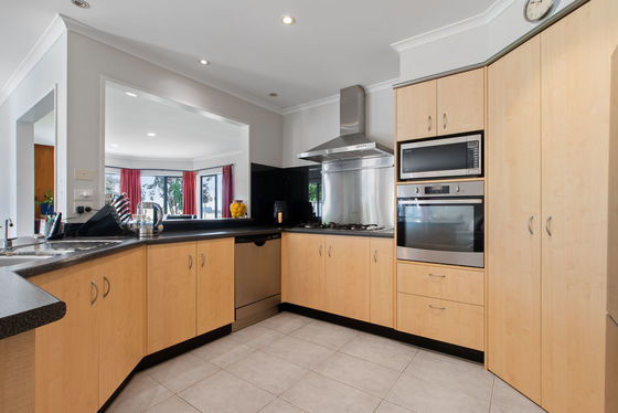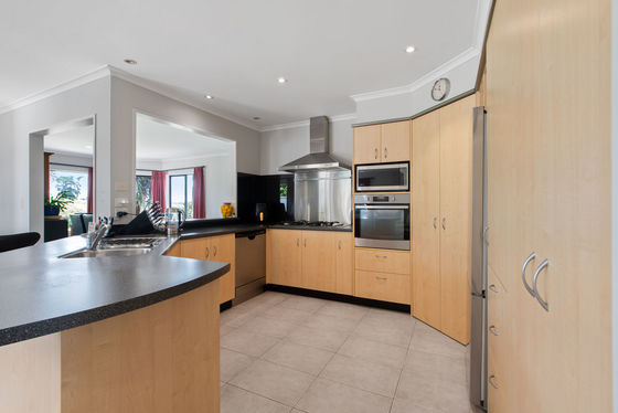 The large kitchen with gas cooking forms the heart of the home. Off the north facing family room, two sets of doors lead out to a spacious, sun-drenched entertaining area, perfect for BBQs and gatherings.
