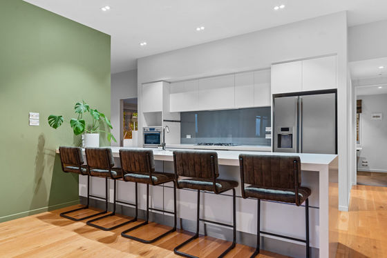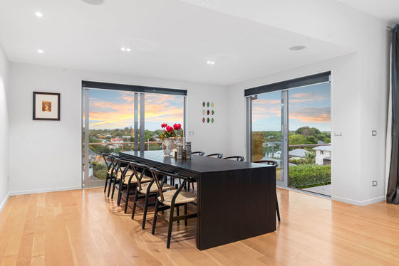 The open-plan living and dining pavilion forms the heart of the home, anchored by solid timber flooring and a contemporary kitchen complete with an expansive island, gas cooktop, and premium appliances, the perfect backdrop for both family life and entertaining. Two generous lounge areas flow to expansive terraces, creating effortless indoor-outdoor living where you can relax, dine, or simply soak in the views.