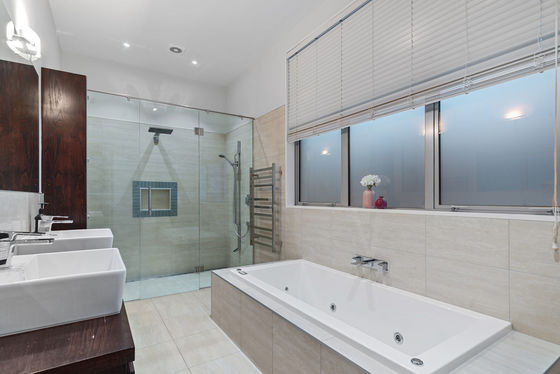 Accommodation is well considered, with five spacious bedrooms and three beautifully appointed bathrooms. The master suite is a true retreat featuring a private balcony, walk-in robe, and a luxe ensuite with spa bath, while the guest suite also enjoys its own ensuite, ideal for visiting family or teens.