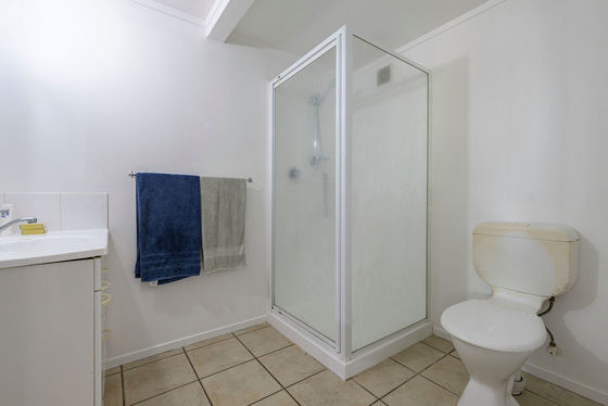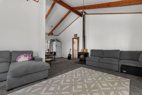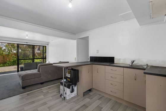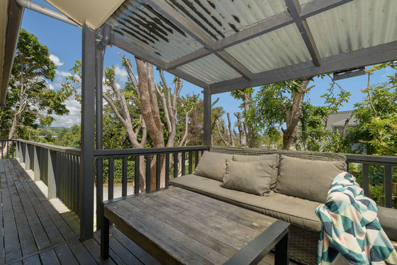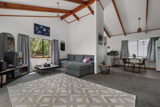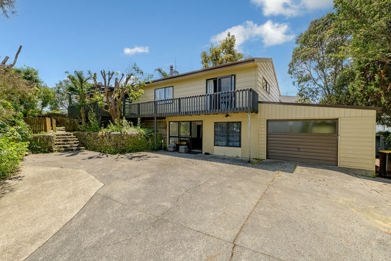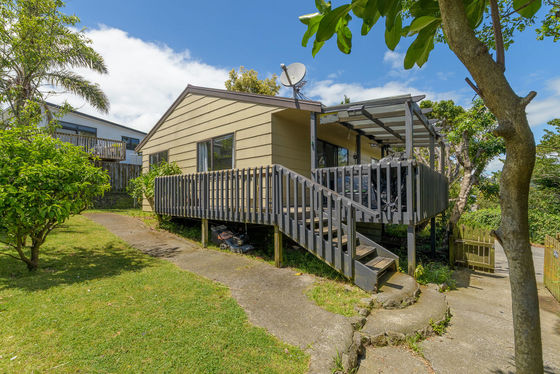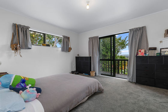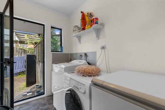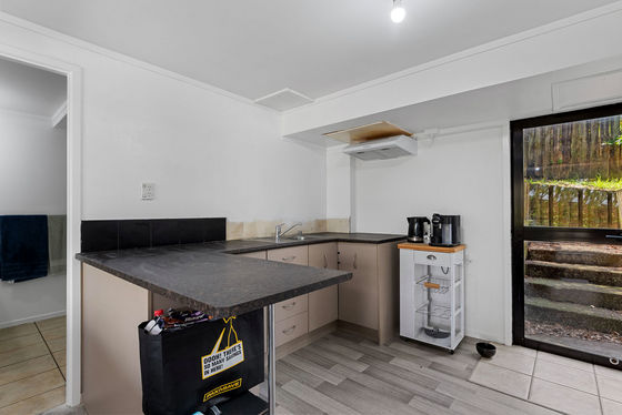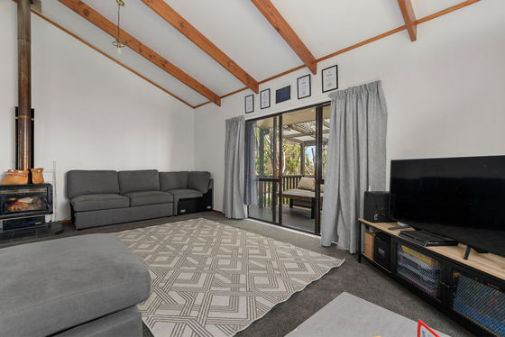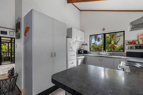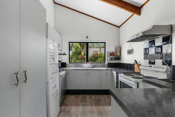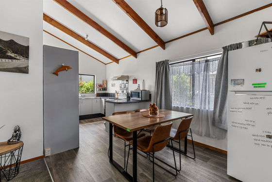 Upstairs, enjoy a light-filled three-bedroom, one-bathroom home featuring pitched ceilings that create a wonderful sense of space. The master bedroom opens directly to the deck, the perfect spot to unwind and soak in the green Welcome Bay outlook. A woodburner keeps the home warm and cosy through winter, and a separate laundry adds everyday practicality.