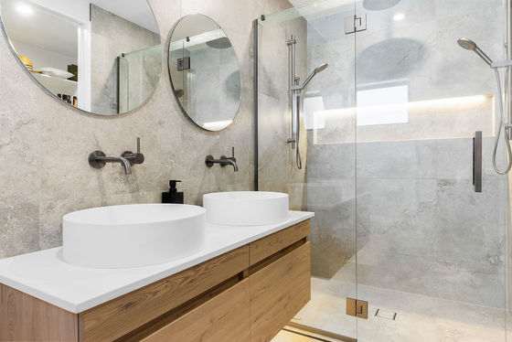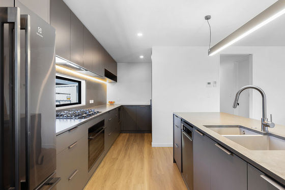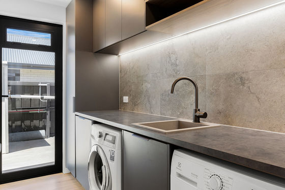 - Designer kitchen with stone benchtops, seamlessly extending to the open pantry and quality appliances anchoring the open plan living zone.