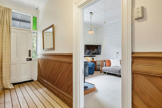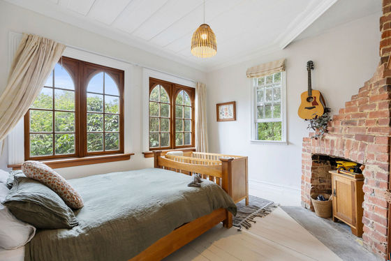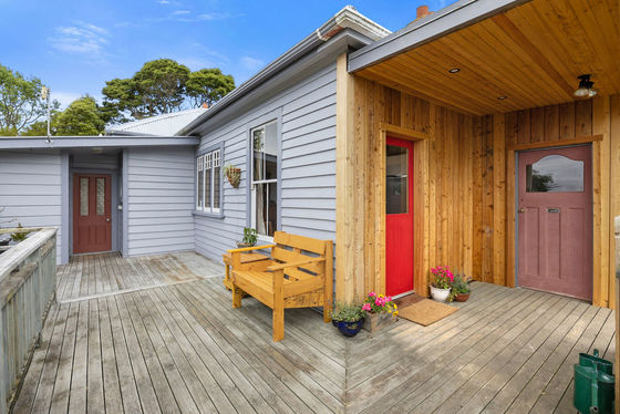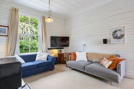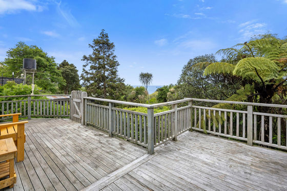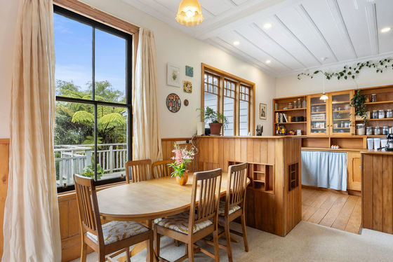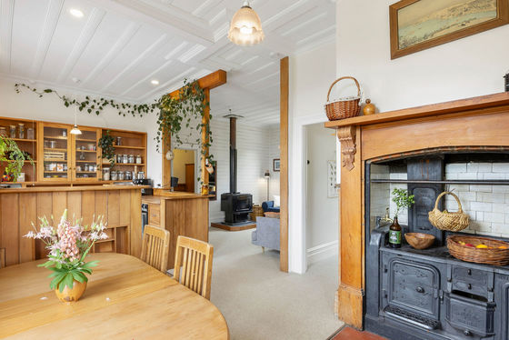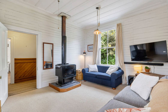 Step inside and you'll immediately feel the charm: beautiful old church-style windows, coloured glass, warm wooden floors, and feature fireplaces that speak to the home's history. The country-style wooden kitchen connects seamlessly to the open-plan dining and living area, kept cosy with a wood burner. From here, step straight out onto the large deck"the perfect spot to take in the coastal outlook while overlooking lush green gardens alive with native birds. The deck also provides handy access to a storage room, the bathroom, and the dining area.