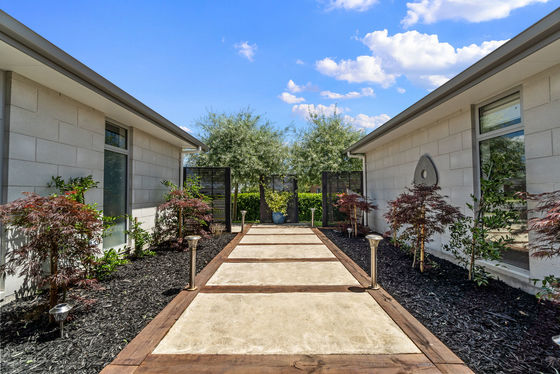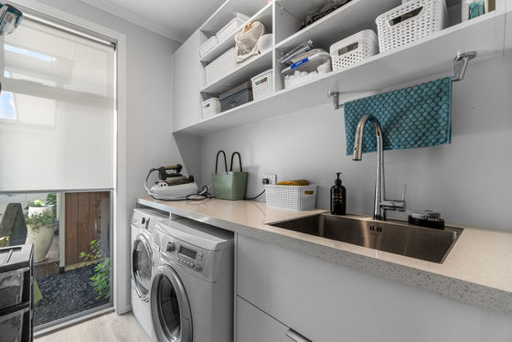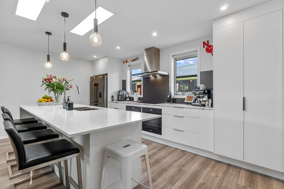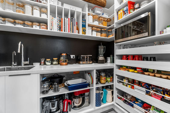 - Designer kitchen with stone benchtops and a scullery with drawers, shelving and sensor lighting.