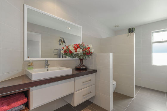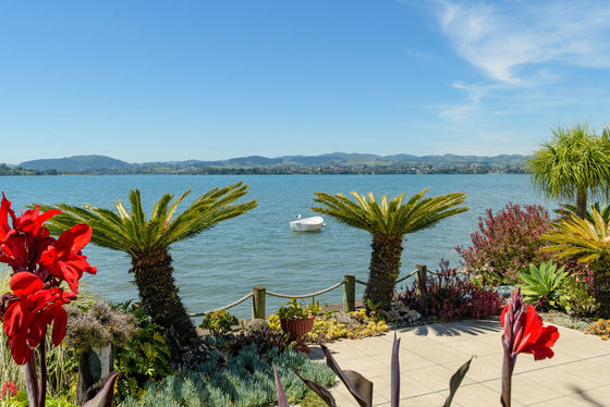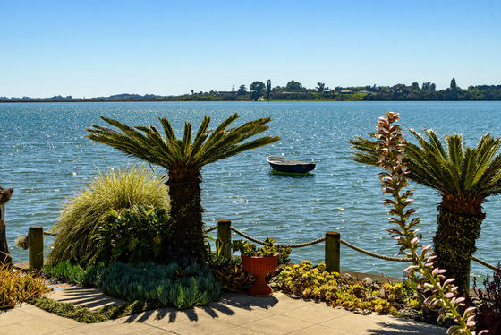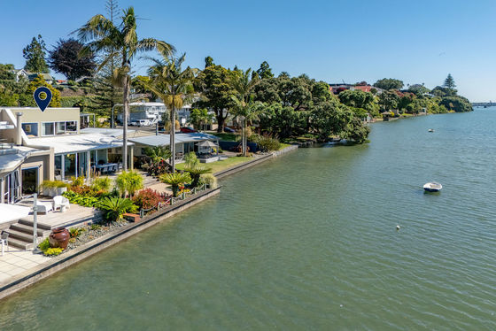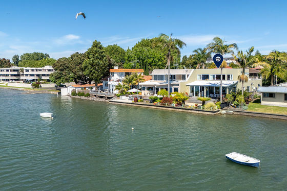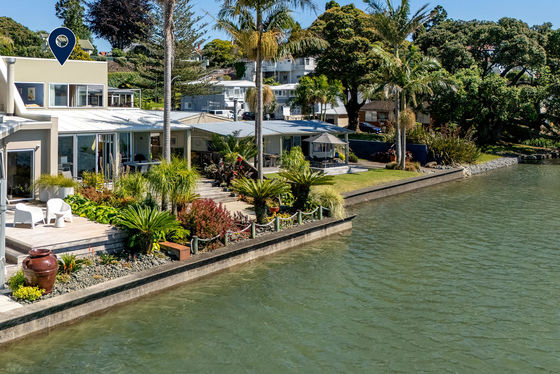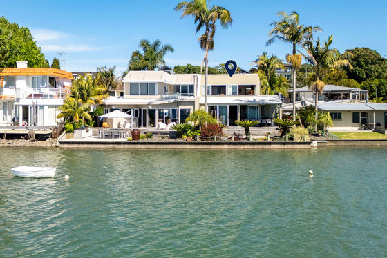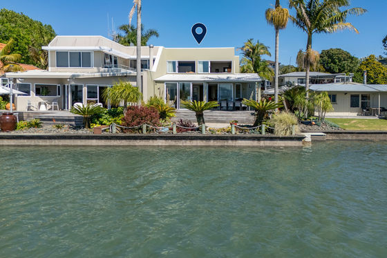 Crazy paving, tropical plantings and a tinkling water feature frame the front entrance, opening to solid oak floors, plush carpets and bright sunshine on sparkling water through over height floor to ceiling glazing. With spacious open plan living warmed by a gas fire, formal dining and a long central kitchen, easy indoor/outdoor flow to the deck and paved patio on the water's edge ensures relaxing peacefully or entertaining is a breeze. Swim, kayak, jet ski or fish right in your watery backyard! A large principle bathroom is ensuite to the adjoining bedroom, with a well appointed laundry and double garage to finish the ground floor of this tranquil and private home.