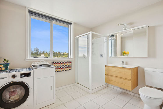 Two generous double bedrooms both enjoy views, while a formal entry adds a sense of arrival rarely found in apartment living. The modernised tiled bathroom includes a heated towel rail with laundry neatly incorporated, keeping the layout both practical and uncluttered.