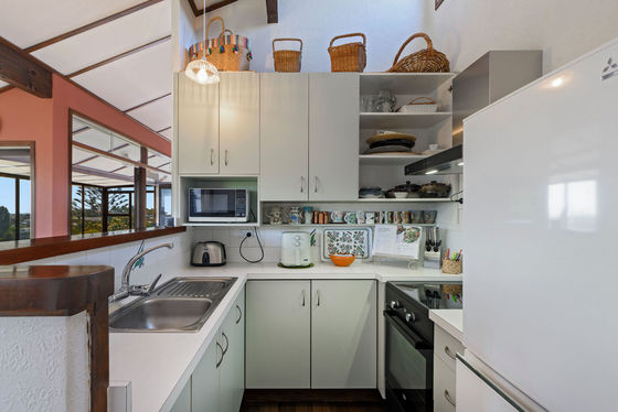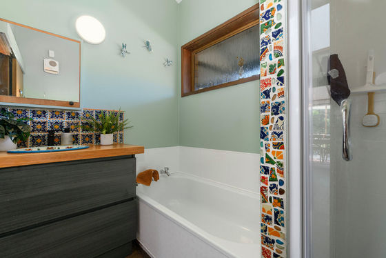 Both bedrooms are well proportioned with built in robes, complemented by a full bathroom with bath and shower that is vibrant, stylish, and full of personality. The kitchen is functional yet welcoming, offering generous storage, modern appliances, and rustic touches.