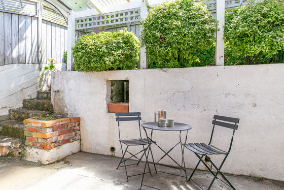 French doors open to a sweet covered courtyard and elevated terrace garden