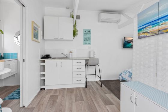 Outside, the fully fenced yard gives kids and pets plenty of room to run and play, and there is ample secure off-street parking for a boat or caravan. Established fruit trees including avocado, lemon, feijoa, and plum add a little everyday joy. A thoughtful bonus of this home is the hot outdoor shower, which is a welcome luxury after salty swims and sandy feet. A surprise feature of this home is the detached double garage, where one side has been thoughtfully converted (unconsented) into a stunning additional space complete with its own bathroom, kitchenette, and private entrance. It's an ideal setup for guests, extended family, or teenagers seeking their own space.