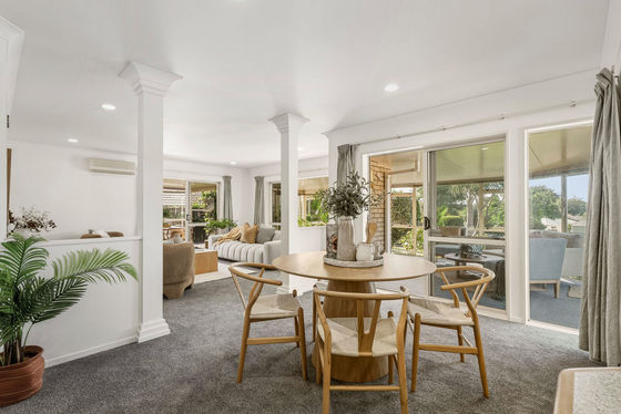 Inside, the home has been freshly painted and newly carpeted, creating a bright, welcoming feel throughout. The heart of the home is the spacious open-plan living area, warmed by a heat pump and designed to connect effortlessly with the outdoors. Large sliders open to a covered deck and landscaped backyard, offering an inviting space for entertaining or relaxed everyday living. Established feijoa trees and grapevines add both charm and seasonal enjoyment.