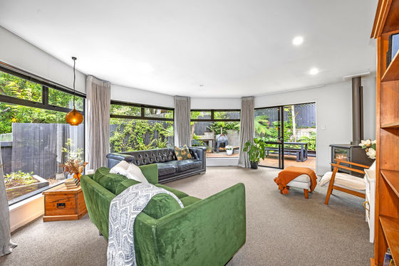 The modern kitchen and dining area capture picturesque views, while elegant French doors open through to the lounge, providing flexibility for open plan living or a cosy, separate retreat. Warm and inviting, the lounge features a wood burner - ideal for the winter months - and flows seamlessly to the meticulously landscaped outdoor area. This lush green oasis offers the perfect setting for relaxed living or generous entertaining.