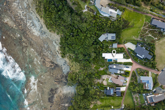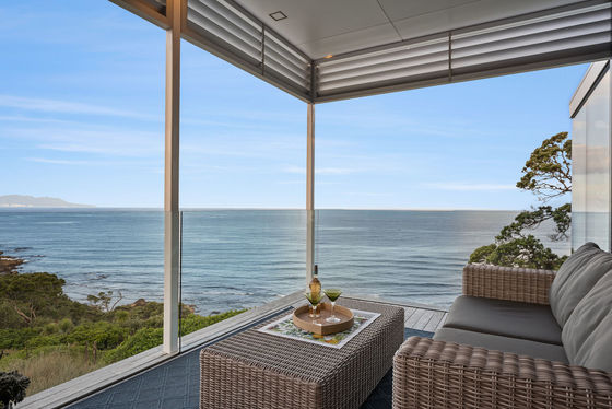 The home is single-level and designed for ease. Floor-to-ceiling windows capture the outlook while maintaining privacy and shelter. The cantilevered living area extends toward the view, creating a strong connection to the ocean and a sense of being right above the water.