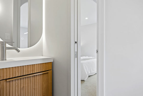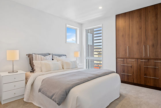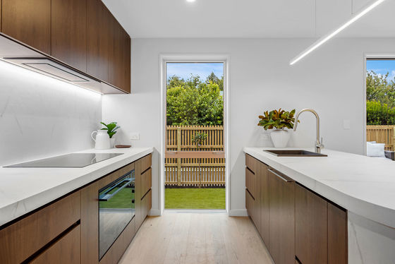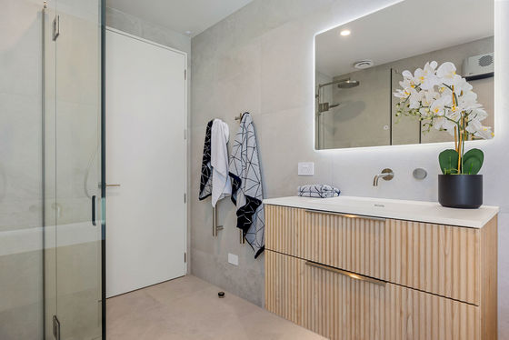 All bedrooms are fitted with custom joinery wardrobes, enhancing both storage and visual appeal. At the heart of the home, the open-plan kitchen, dining, and living area is anchored by a truly standout kitchen, featuring custom microcement benchtops and splashbacks, a 90cm pyrolytic oven, induction cooktop, and an integrated double-door fridge - a space designed to impress while remaining highly practical.