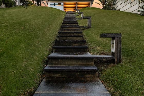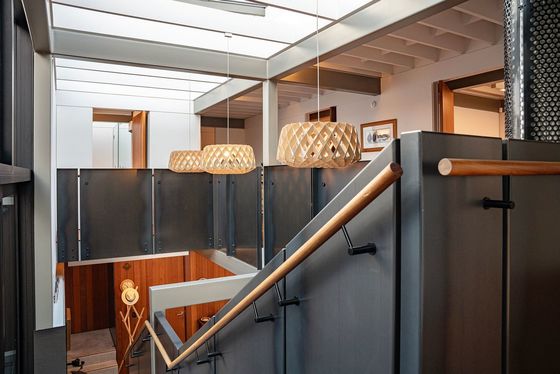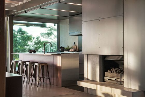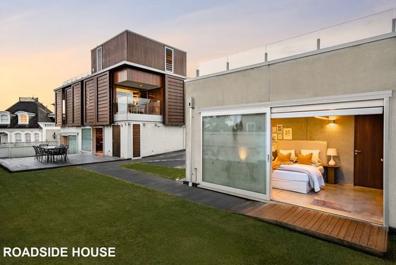 The roadside residence is the smallest of the three and offers two large double bedrooms. Its striking features of brass panelling, precast concrete and cedar complement the other two homes. It offers a cosy living and dining area opening to decks and lawn, a galley-style kitchen generous second bedroom or studio, a separate bathroom, and the upper-level offers a master suite with an ensuite and access to a roof deck with sea views.
