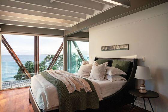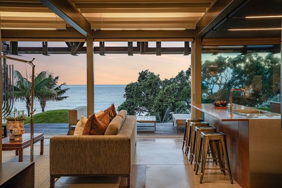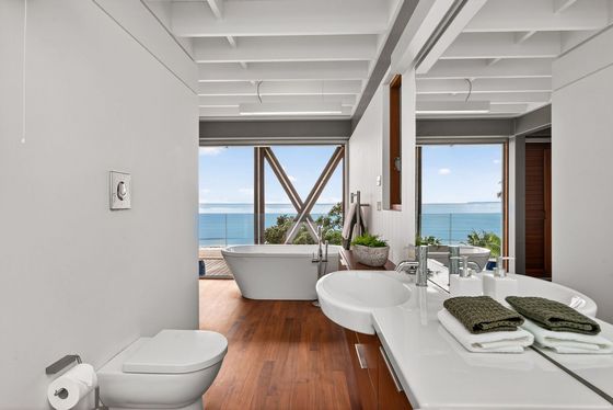 The main residence positioned on the beachfront is a striking combination of cedar, precast concrete and sliding screens, combining industrial permanence with refined coastal living. Expansive floor-to-ceiling double glazing captures superb sea views from the open plan living, dining and kitchen area. Concrete floors with gas underfloor heating, a feature fireplace and an adjoining sunroom grace the lower level. A dramatic double-height void leads upstairs to the master suite with a private lounge, full-width deck and large ensuite with a bath offering one of the best views- superb. A second double bedroom connects to a full bathroom, while a third bedroom or second master suite includes its own living area, ensuite and deck. A generous double garage, gated driveway access and full security system complete the primary home. This home could easily be made into four bedrooms as the fourth was amalgamated into the master suite by the owners.