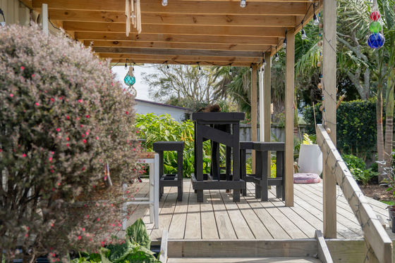 Wide deck overlooking a landscaped tropical garden