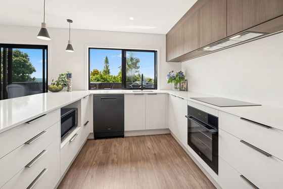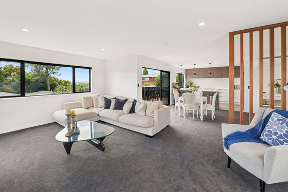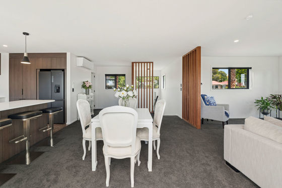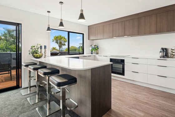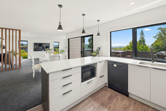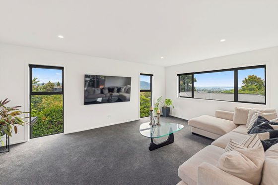 Upstairs is an entertainer's dream, featuring a beautiful open-plan kitchen with peeks of the lake. The kitchen flows effortlessly through the dining room into the living area, creating a spacious and inviting space for gatherings. A separate toilet upstairs adds convenience for everyday living and entertaining. From the dining room, a balcony looks out over the landscape, offering views of Mount Ngongotaha Lake Rotorua and the serene surroundings.