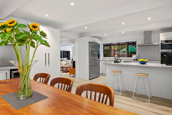 The designer kitchen (with quality Miele appliances) along with living areas and conservatory are on the downstairs level which flows out to a private deck where you can relax taking in the serenity with a cup of coffee or your favourite tipple while you listen to and watch the bird life from the well-established bush setting. Certainly, a wonderful spot to entertain family and friends whilst the children run on the back lawn or play hide and seek in the bush.