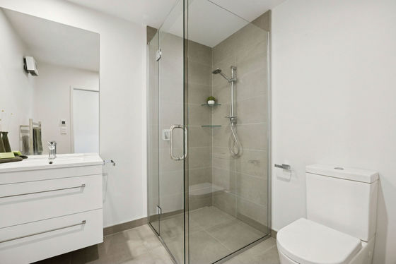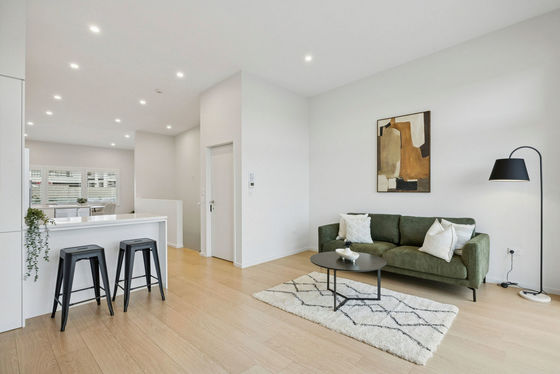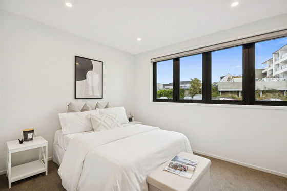 The master suite is a luxurious retreat with walk-in robes and a heated tiled ensuite featuring an oversized shower, dual vanities, and a separate bath, while a second double bedroom is serviced by an equally elegant tiled bathroom. A third bedroom on the entry level adds versatile accommodation for guests, a home office, or hobby space. Designed over 155sqm, the open-plan living area features three-metre-high floor-to-ceiling windows that flood the home with natural light, highlighting the high stud and sophisticated contemporary finishes.