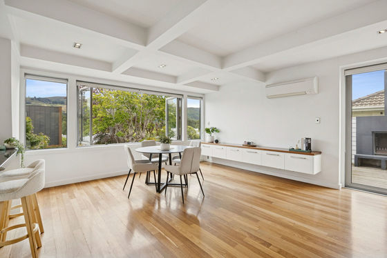 The dining area's bi-folding windows sit at treetop level, creating a wonderful sense of privacy and connection to the surrounding greenery and beautiful outlook. Four double bedrooms with built-in robes include a master with ensuite, while a separate family bathroom offers both bath and shower. Two upstairs bedrooms share access to a sunny deck, ideal for soaking up the afternoon sun.