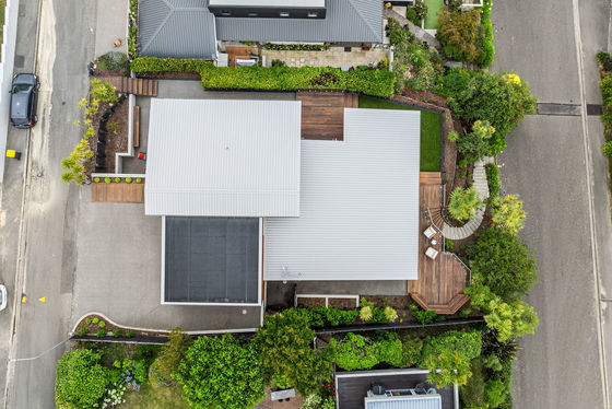 Clad in a warm combination of cedar and plaster, the home presents a confident modern profile that sits naturally within its elevated setting. Inside, a bespoke Palazzo kitchen reflects European design influence, with integrated appliances, gas cooktop and a layout that connects seamlessly to open-plan living and entertaining spaces including a spacious deck with built in seating.