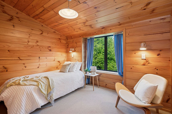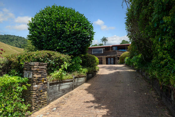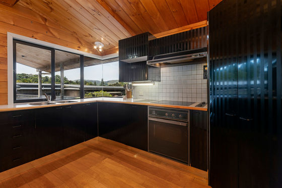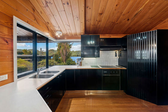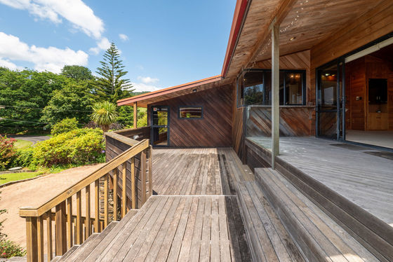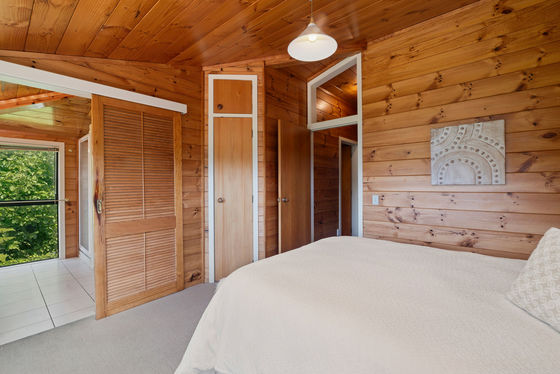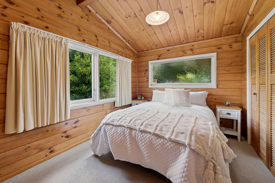 Clad in cedar weatherboard, schist and concrete block, the home nestles harmoniously into mature shrubbery, facing views of the lake, bush and farmland.