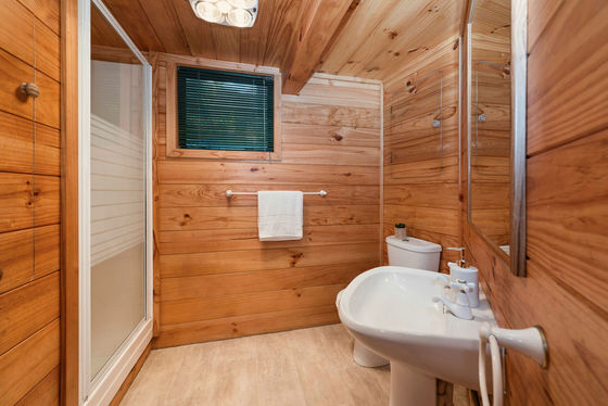 The master bedroom occupies a corner of the home, opening directly to the deck. Complete with an ensuite and a striking feature window that frames the waterscape, it offers serenity and flexibility for hosting guests.
