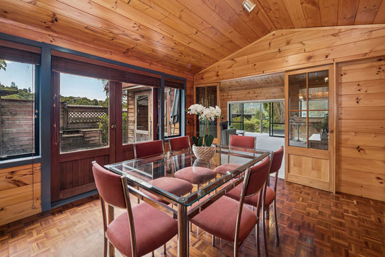 The dining room, with its parquet floors and generous proportions opens out to a patio where a grape-vine covered pergola creates a shady haven for summer relaxation and alfresco dining.