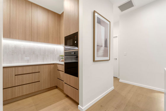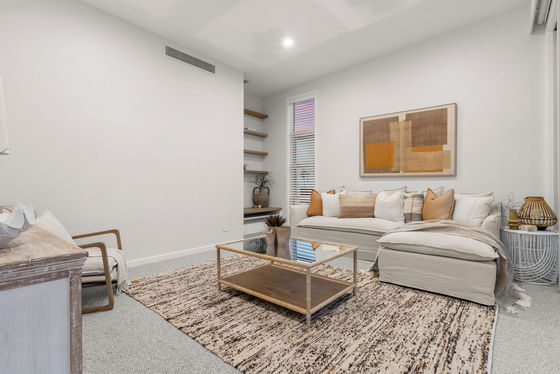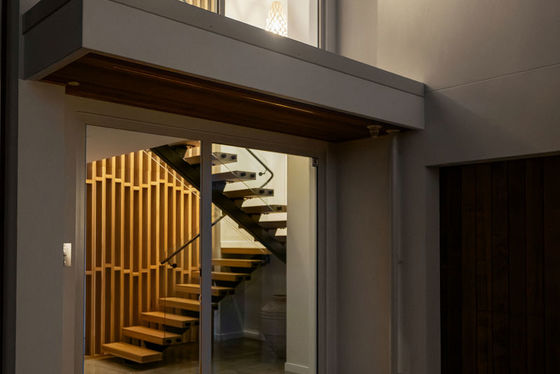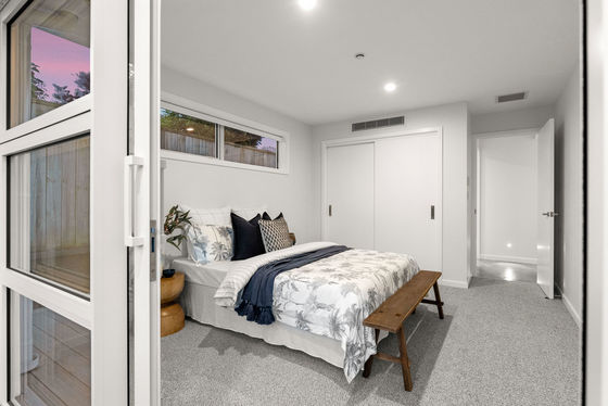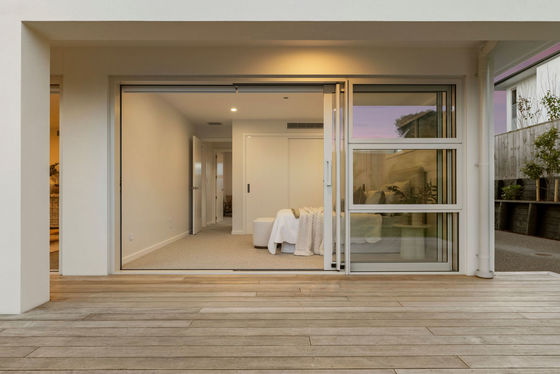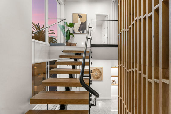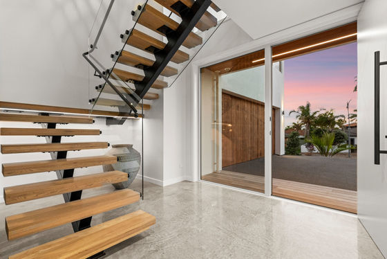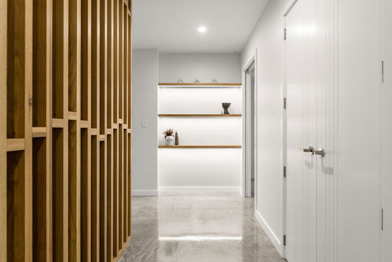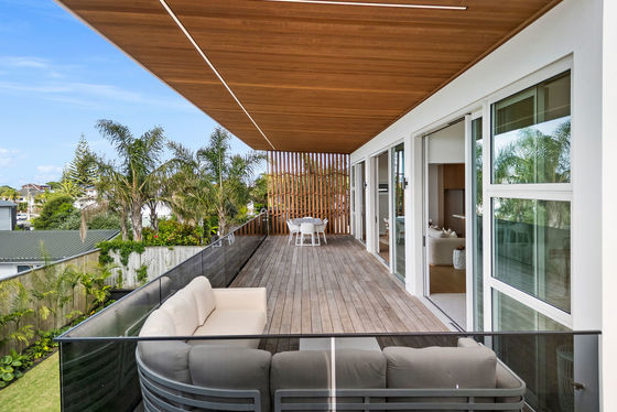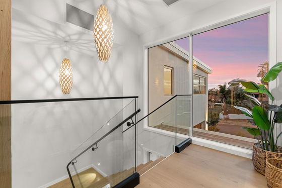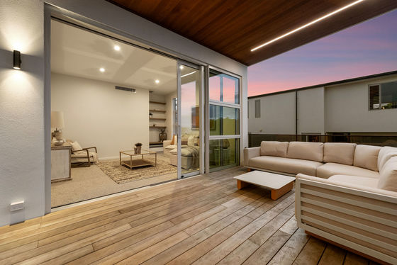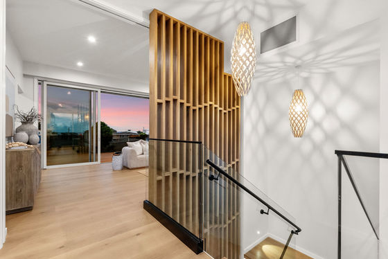 A full-length balcony featuring a strip-lit Alaskan Cedar soffit, offers a dress circle rendezvous for alfresco dining and sundowner drinks. The flush, sill stackable sliders separate the balcony from a bespoke media room and spacious open plan living and dining areas. The engineered oak flooring extends to a customised gourmet kitchen with scullery where high-quality cabinetry, porcelain benchtops, and state of the art appliances dominate. A central American White Oak stairwell atrium capturing picturesque vistas, features iconic David Trubridge fittings. Three underfloor-heated, porcelain-tiled bathrooms are supported by a separate powder room. The ensuite and powder room feature LED backlit mirrors, while monsoon shower systems are included in the guest bathroom and master ensuite. Five bedrooms include a substantial master suite upstairs while downstairs, the self-contained guest area shares a third lounge with a chic galley kitchen and pantry. This assigned domain benefits from exterior flow to wide decking and fenced lawns (with room here for a pool.) The energy-efficient high-tech residence with elevator between floors, has temperature-controlled ducted heating and cooling, gas fireplace, extensive insulation, and Low-E thermal glazing in upper floor entertainment zones for year-round comfort.