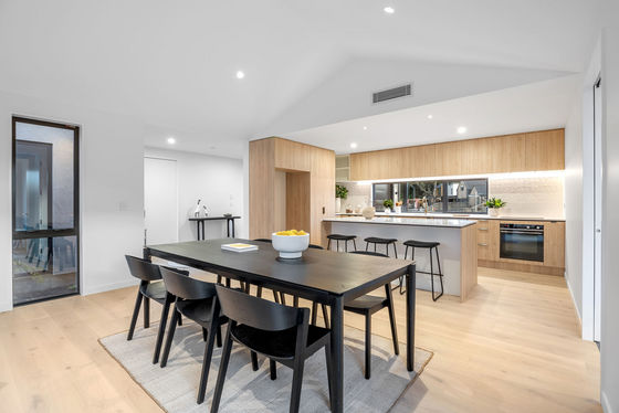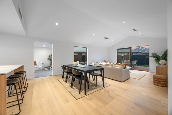 An expansive open-plan living and dining room unfolds beneath a cathedral ceiling, with a quality kitchen taking the lead, featuring exceptional specifications and a social centrepiece island.