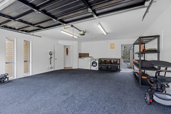 The spacious double garage includes internal access and carpet, making it ideal for flexible use beyond vehicle storage. There is also off-street parking for extra vehicles.